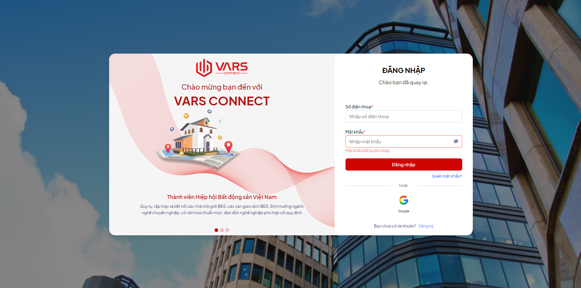 **Bước 1**: Bạn truy cập vào hệ thống qua đường dẫn: [https://cms.vars.vn](https://cms.vars.vn/user/information). Sau đó thực hiện đăng nhập vào tài khoản của bạn.