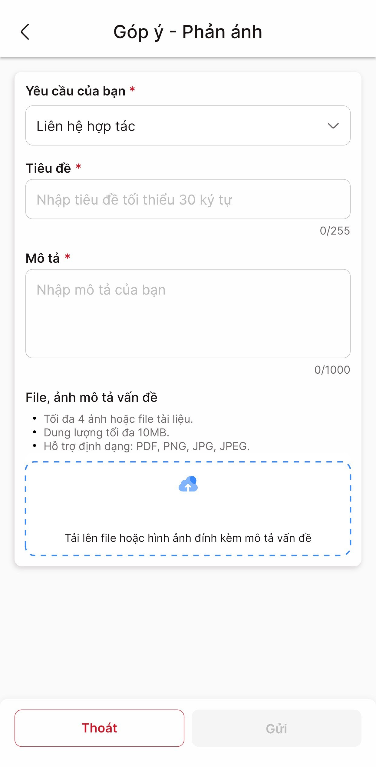 **Bước 3**: Tại màn hình **Góp ý, Phản ánh**, bạn có thể chọn **Loại yêu cầu** sau đó nhập thông tin vào ô **Tiêu đề, Mô tả** và đính kèm các hình ảnh (nếu có). Kiểm tra nội dung tin sau đó nhấn **Gửi**.
