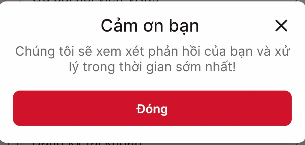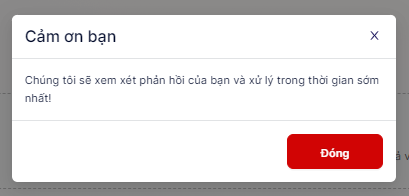 **Bước 4**: Sau khi **Gửi** thành công, hệ thống sẽ xuất hiện thông báo **Cảm ơn** như hình bên dưới.