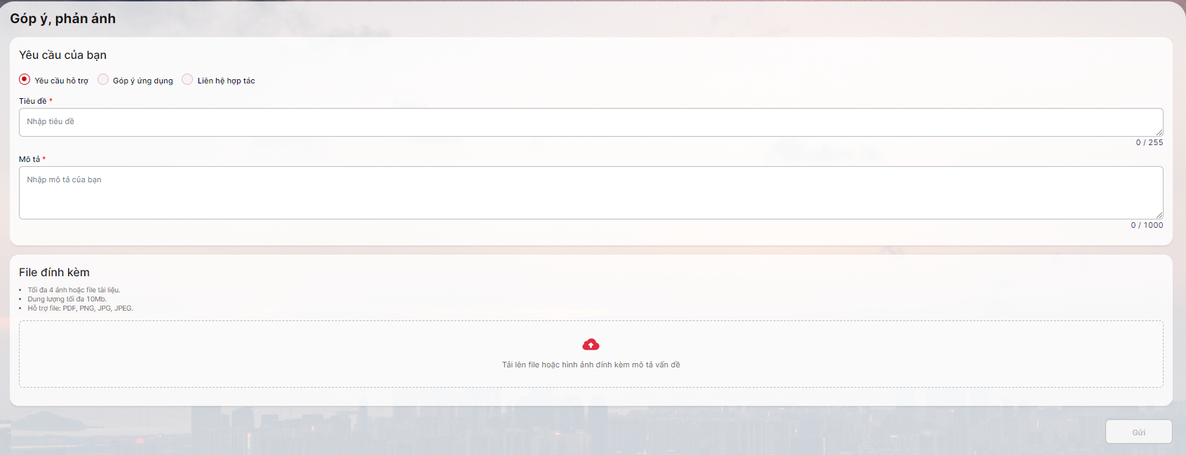 **Bước 3**: Hệ thống sẽ xuất hiện màn hình **Góp ý - Phản ánh** như bên dưới, bạn có thể chọn **Loại yêu cầu**, sau đó nhập thông tin vào ô **Tiêu đề, Mô tả** và đính kèm các hình ảnh (nếu có). Kiểm tra nội dung tin sau đó nhấn **Gửi**.