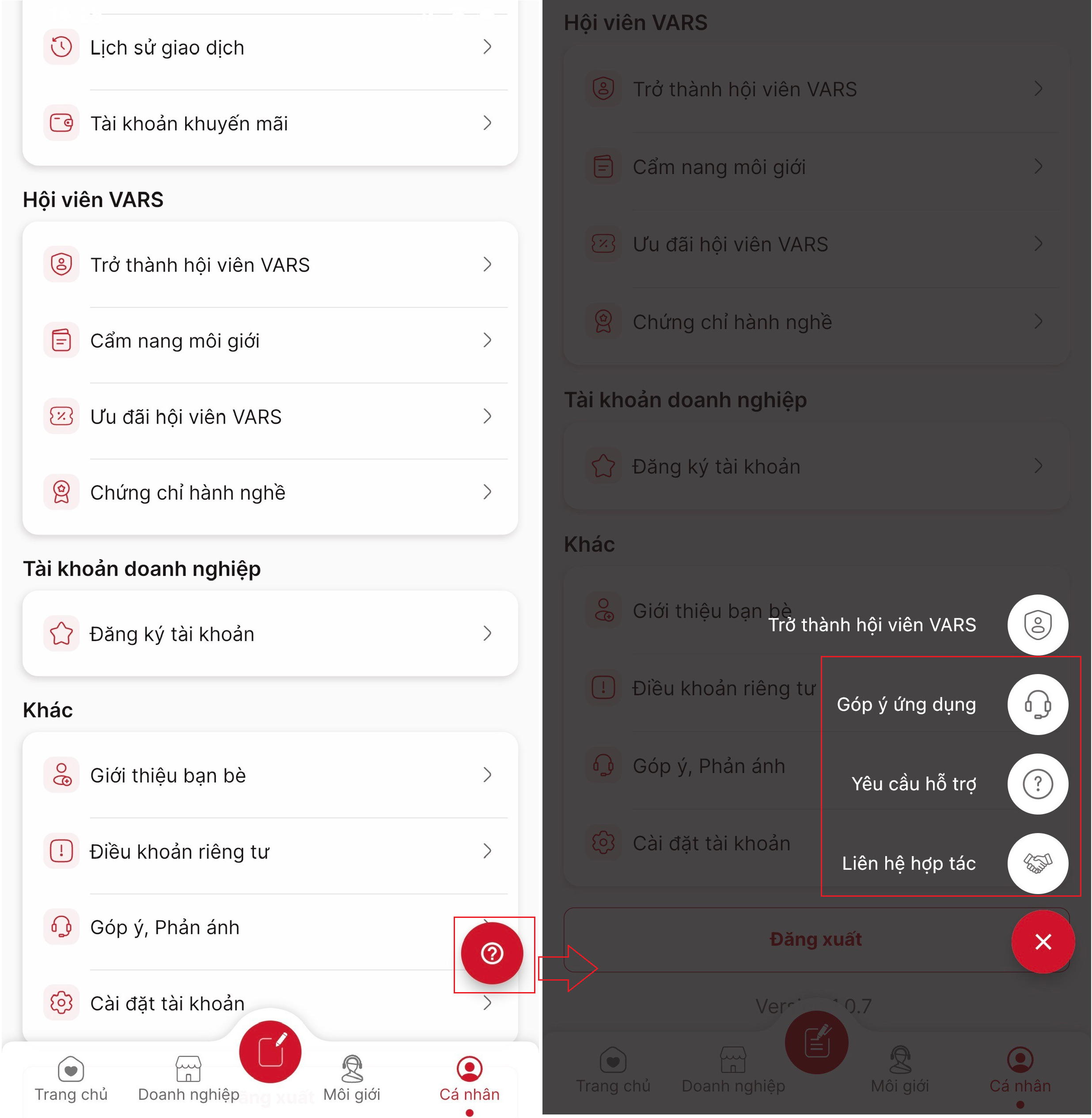 **Bước 2**: Tại màn hình **Cá nhân**, bạn kéo xuống dưới và nhấn chọn **Góp ý, Phản ánh**. Hoặc truy cập nhanh bằng cách chọn biểu tượng **dấu hỏi** <img src="https://content.gitbook.com/content/9EgKjWbun4juwyJmxoyZ/blobs/z6Mq7NqbBAUFBvvBAjJY/image.png" alt="" data-size="line"> bên phải trang sau đó chọn loại yêu cầu muốn gửi.