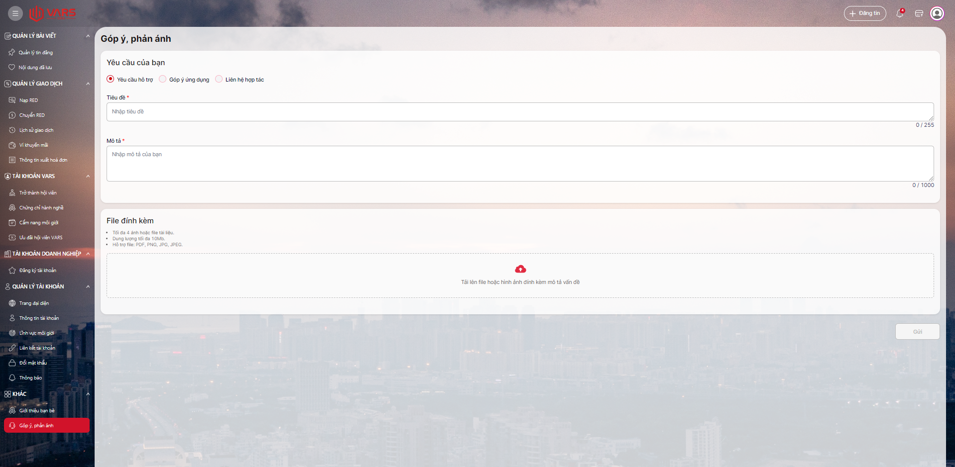 Để gửi Yêu cầu, Góp ý, Phản ánh trên ứng dụng VARs Connect, bạn có thể thực hiện các bước như sau: