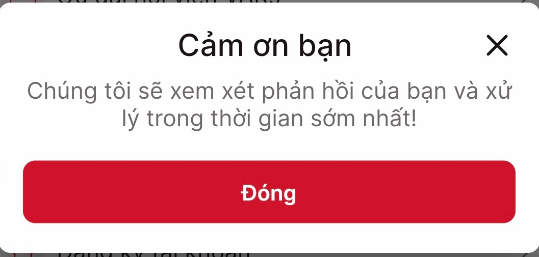 Bước 4: Sau khi Gửi thành công, hệ thống sẽ xuất hiện thông báo Cảm ơn như hình bên dưới.