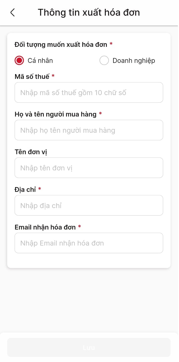 **Bước 4**: Tại màn hình **Thông tin xuất hóa đơn**, bạn chọn **Đối tượng muốn xuất hóa đơn**, điền **Mã số thuế**, **Họ và tên người mua hàng**, **Tên đơn vị** (nếu có), **Địa chỉ** và **Email nhận hóa đơn**. Sau đó nhấn chọn **Lưu**.