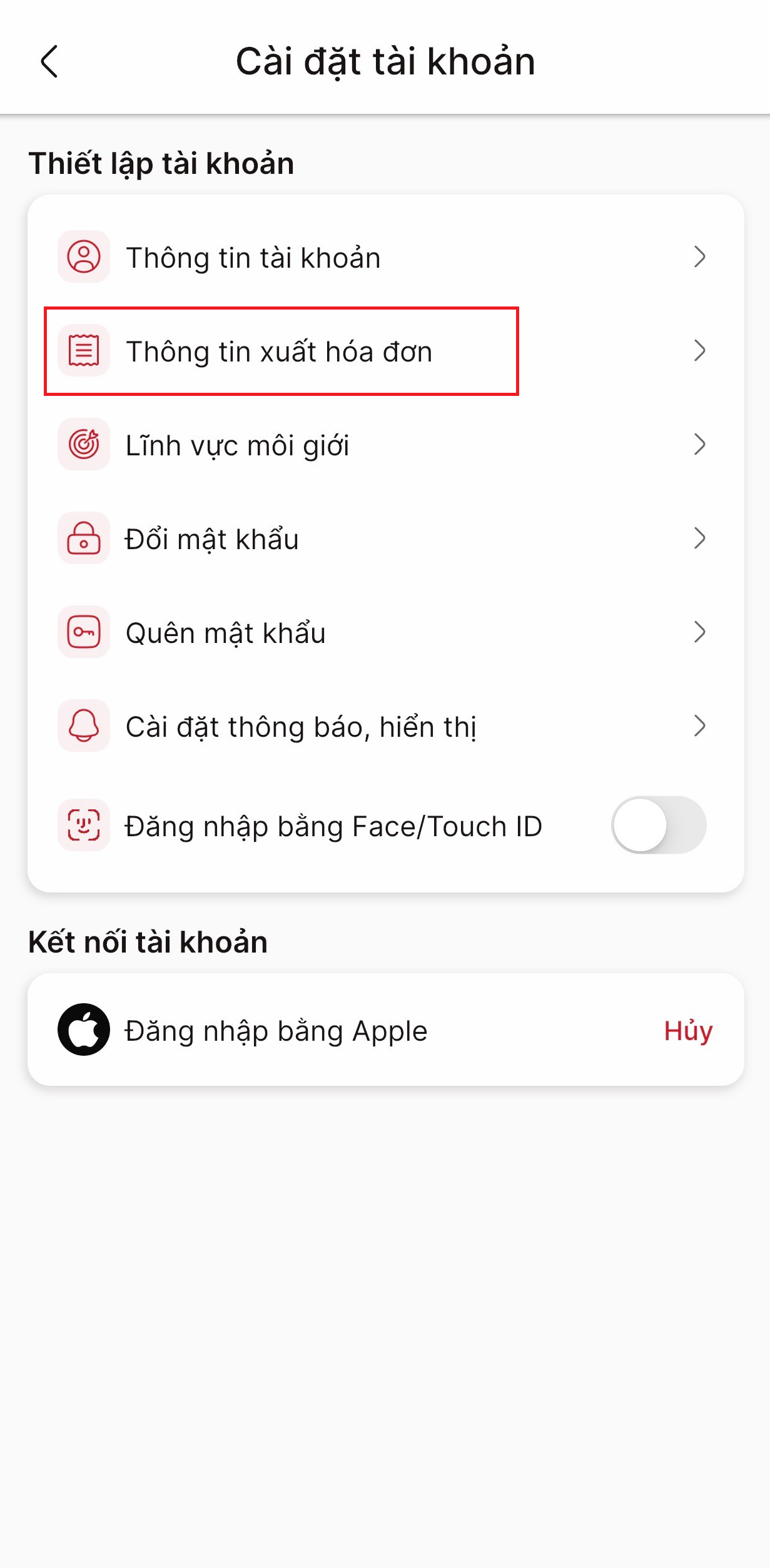 **Bước 3**: Chọn Thông tin xuất hóa đơn