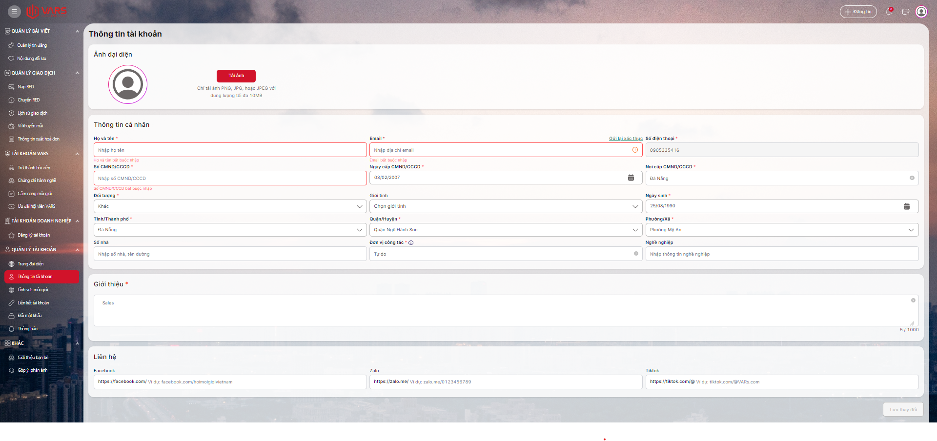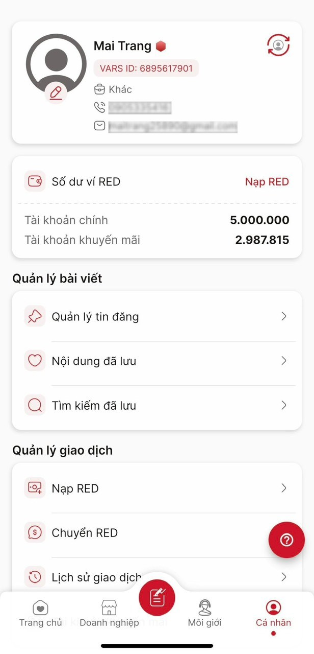Tại trang Cá nhân bạn có thể quản lý bài viết, quản lý giao dịch RED, thông tin cũng như đăng ký Hội viên VARS, Tài khoản Doanh nghiệp cũng như sử dụng các chức năng khác.