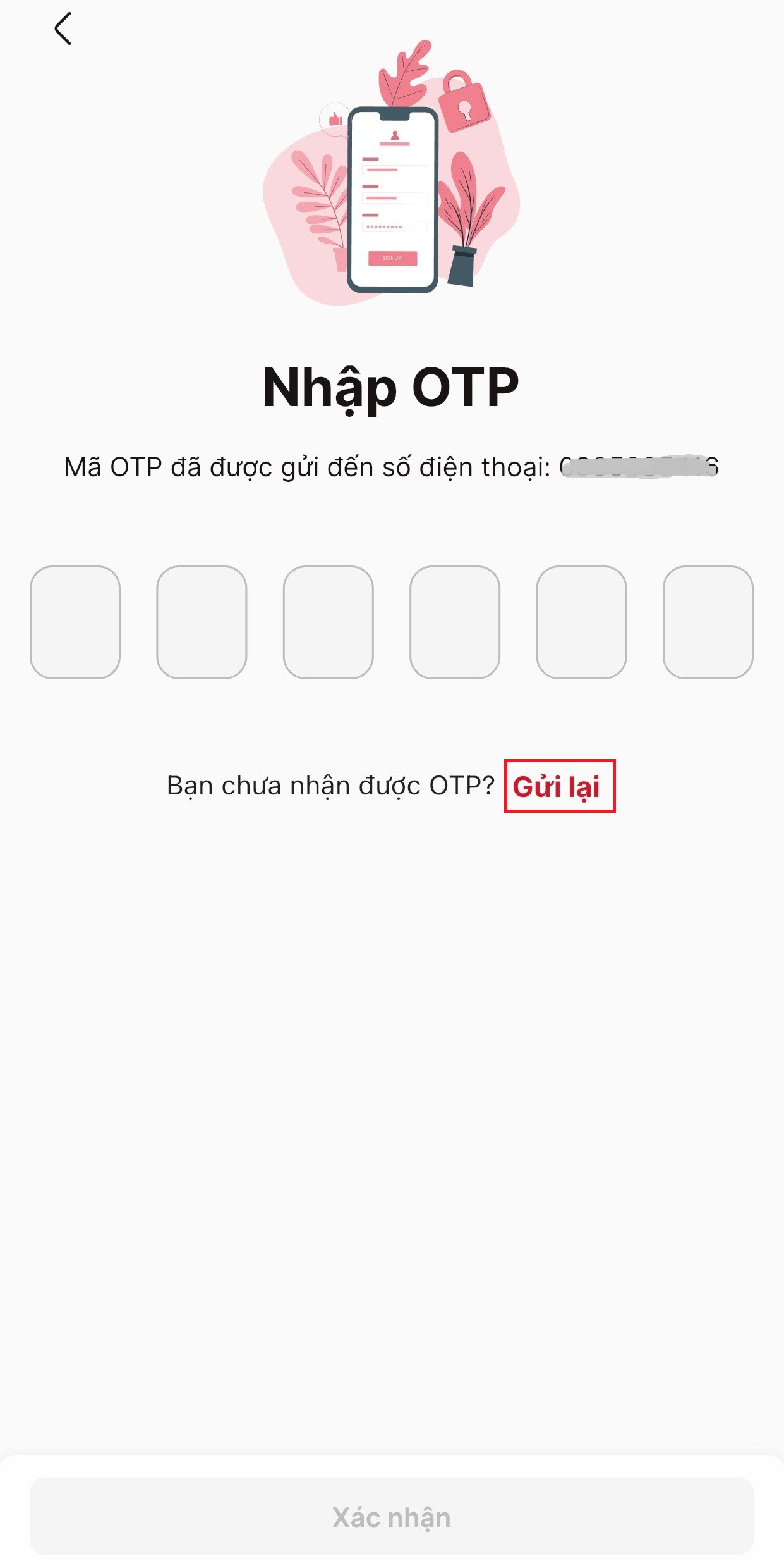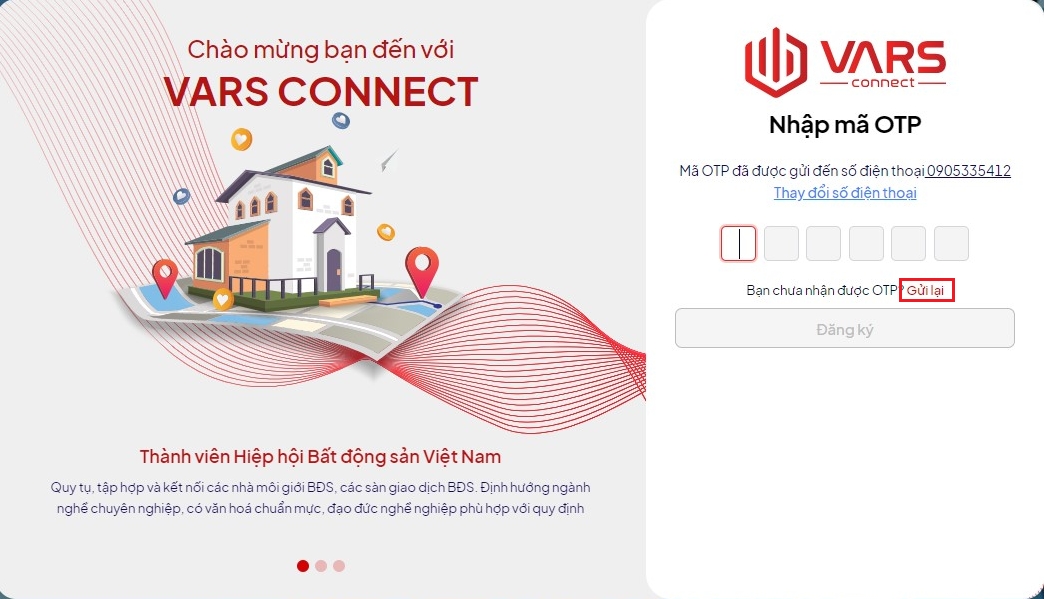 Bạn nhấn chọn Gửi lại ngay dưới ô xác nhận sau thời gian đợi (5 phút) để nhận mã mới tại màn hình Nhập OTP.