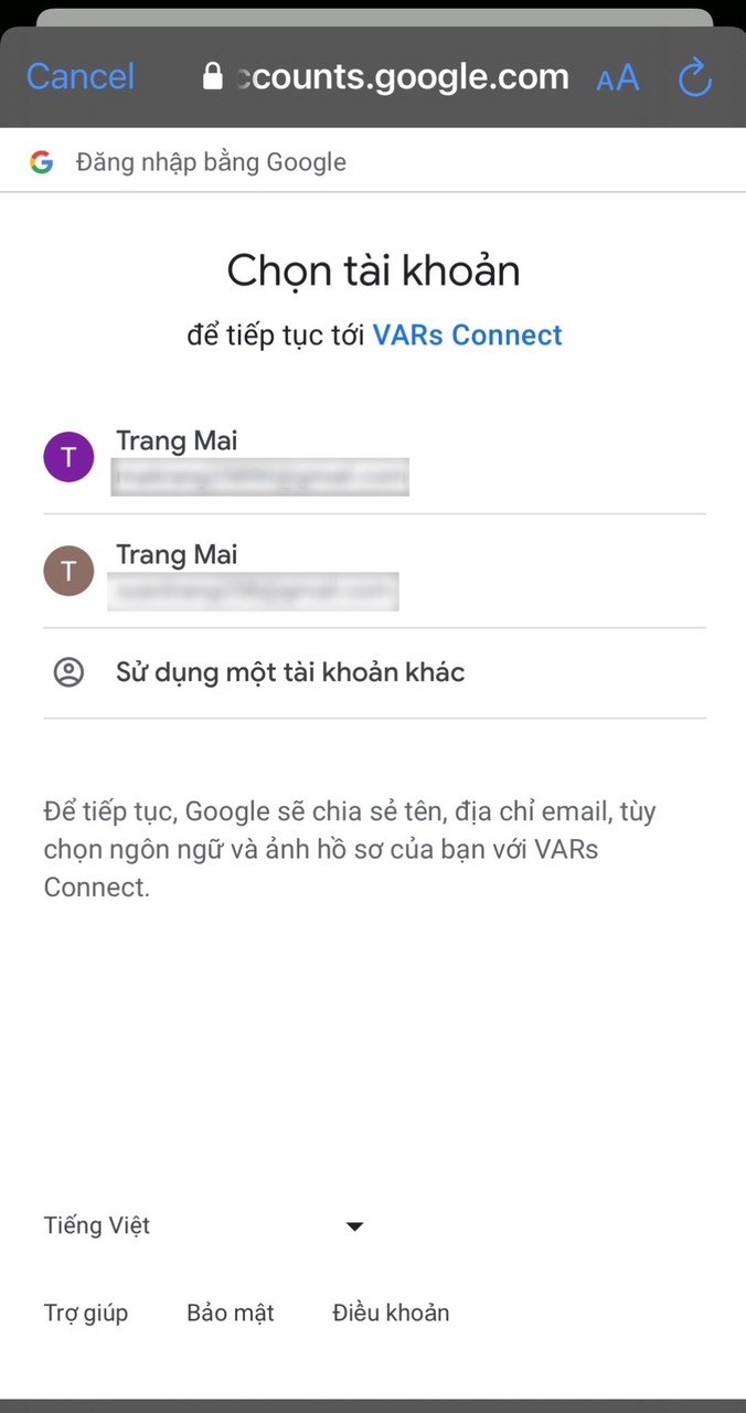 Bước 3: Hệ thống sẽ hiển thị màn hình lựa chọn tài khoản Gmail để đăng nhập như hình dưới. Bạn nhấn chọn 1 gmail đã từng đăng ký tài khoản và hoàn tất quá trình đăng nhập.