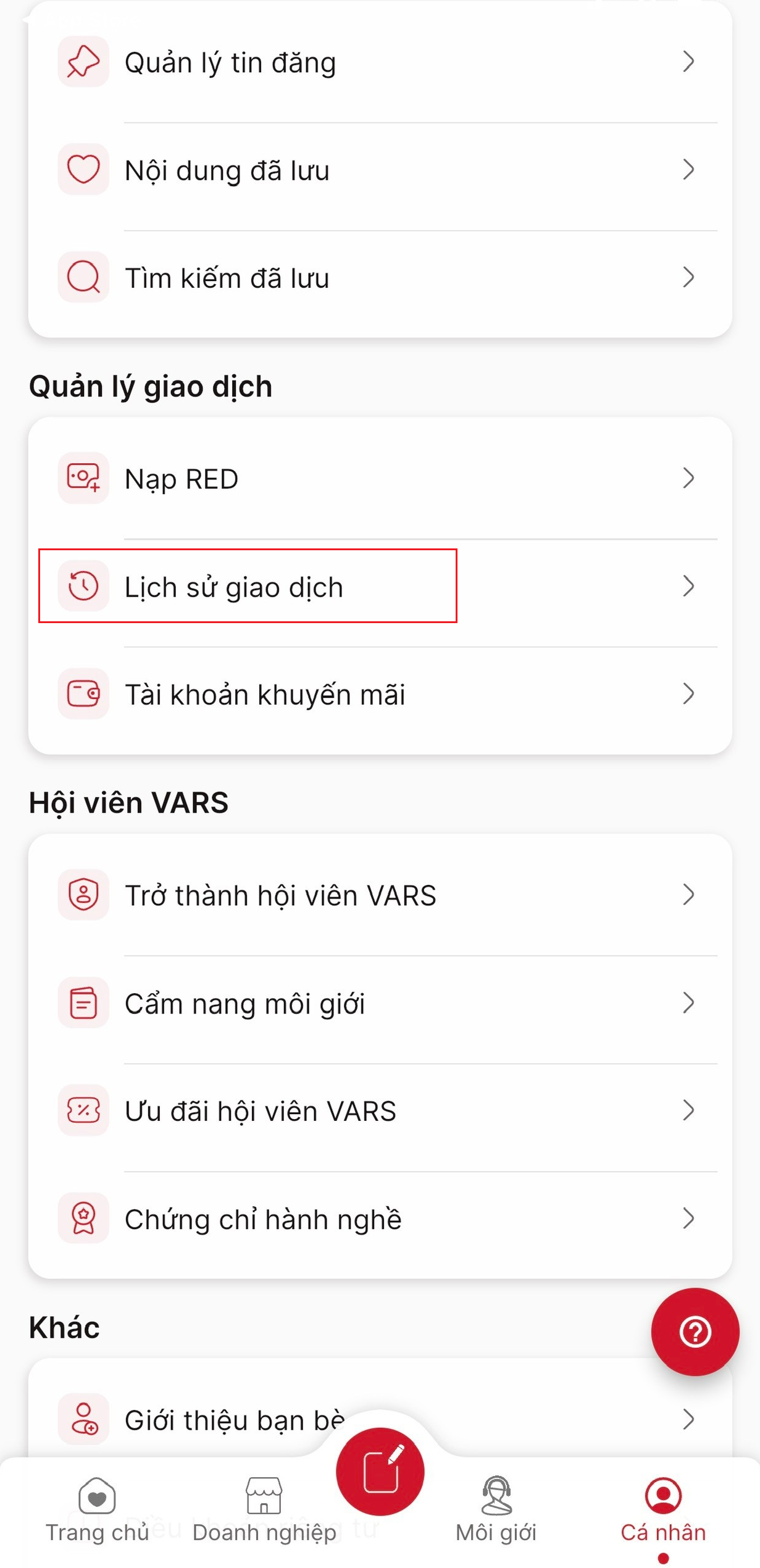 Bước 2: Tại màn hình Cá nhân, chọn Lịch sử giao dịch tại mục Quản lý giao dịch.