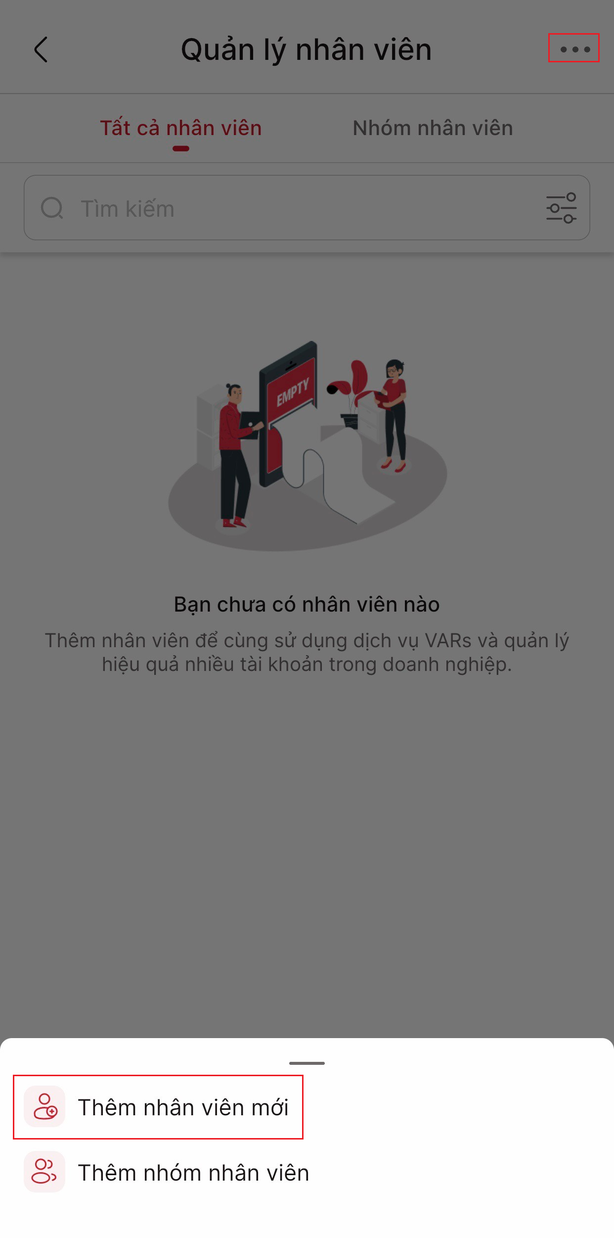 Bước 3: Tại chức năng Quản lý doanh nghiệp, để thêm nhân viên vào tài khoản Doanh nghiệp, bạn nhấn chọn biểu tượng ba chấm, sau đó chọn chức năng Thêm nhân viên.