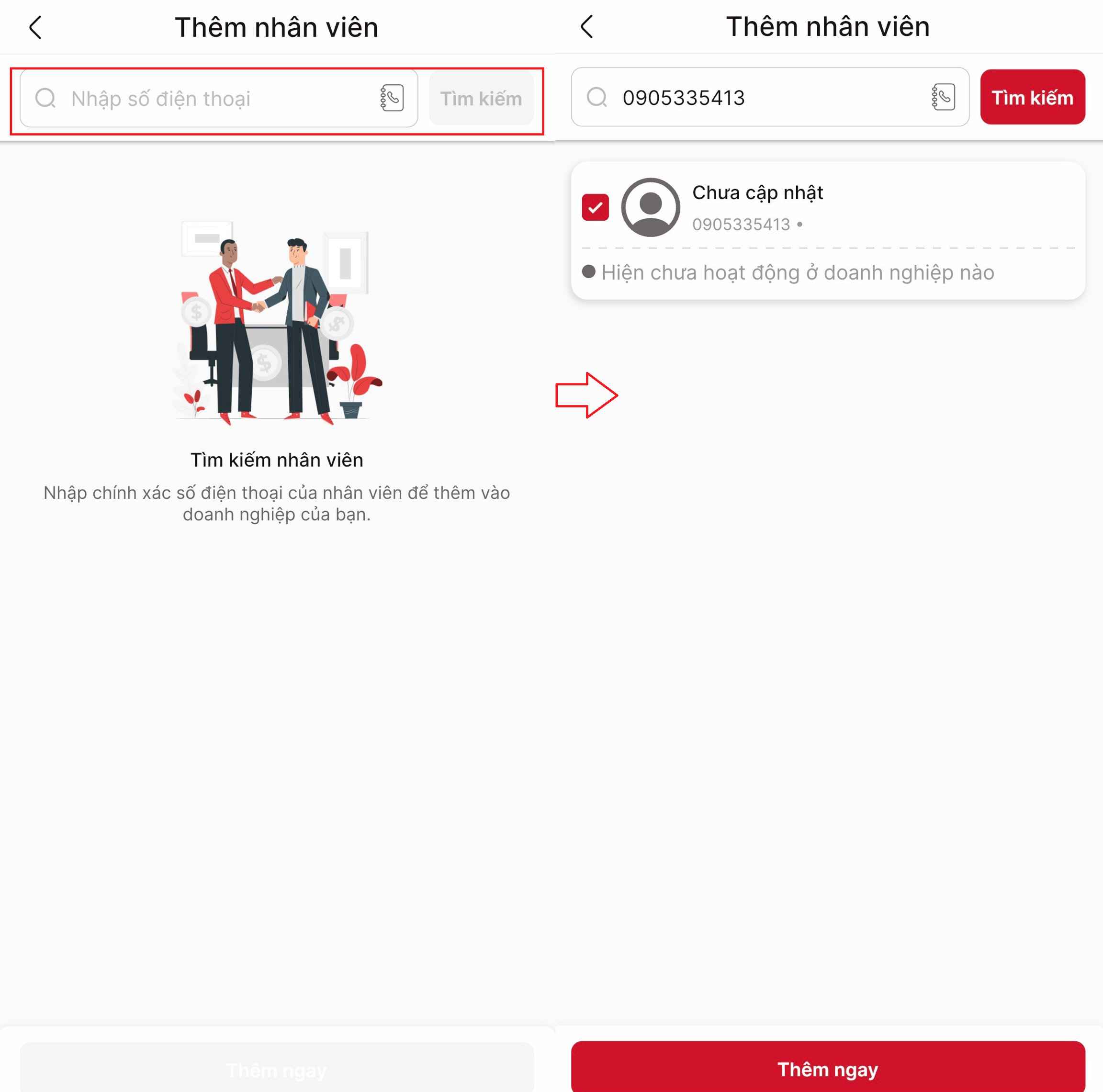 Bước 4: Tại màn hình Thêm nhân viên, bạn có thể Tìm kiếm nhân viên muốn thêm bằng số điện thoại, chọn nhân viên và nhấn Thêm ngay.