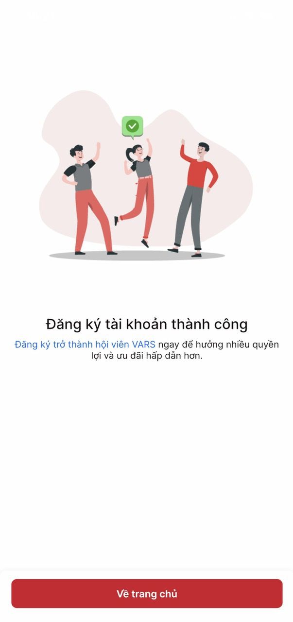 **Bước 5**: Sau khi xác thực thông tin, hệ thống sẽ chuyển đến màn hình **Đăng ký thành công**. Bạn nhấn chọn **Về trang chủ** để bắt đầu trải nghiệm ứng dụng.