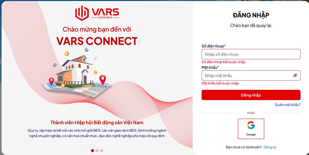 Để đăng ký tài khoản trên hệ thống website của VARS bạn truy cập vào hệ thống qua đường dẫn [vars.vn](https://vars.vn/home). Sau đó bạn có thể thực hiện đăng ký tài khoản theo các cách sau: Đăng ký bằng Số điện thoại, Đăng ký bằng Google.