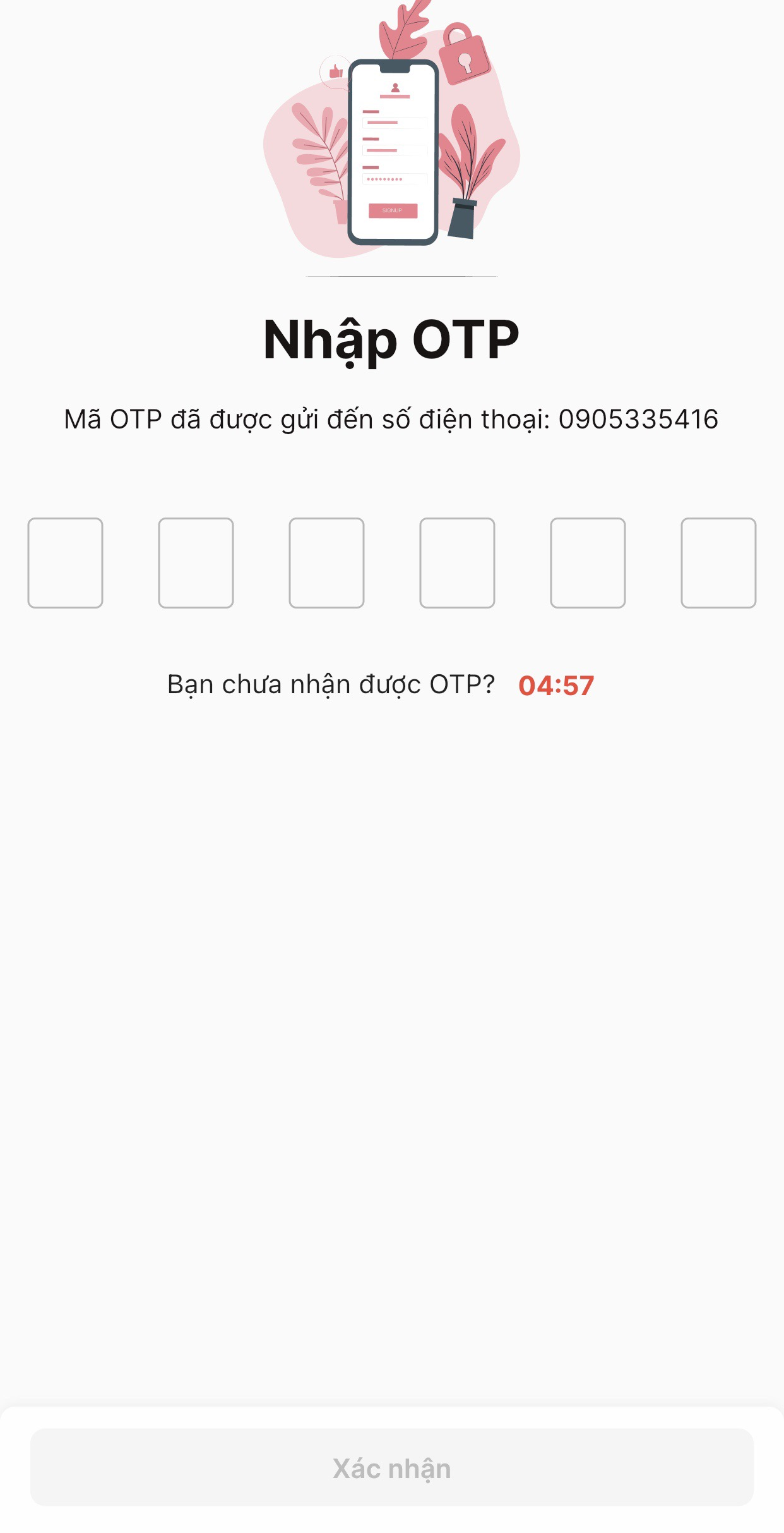 **Bước 5**: Tại màn hình **Nhập OTP**, bạn nhập mã OTP đã được gửi đến số điện thoại mà bạn đã nhập ở **Bước 3** và nhấn nút **Xác nhận**.&#x20;