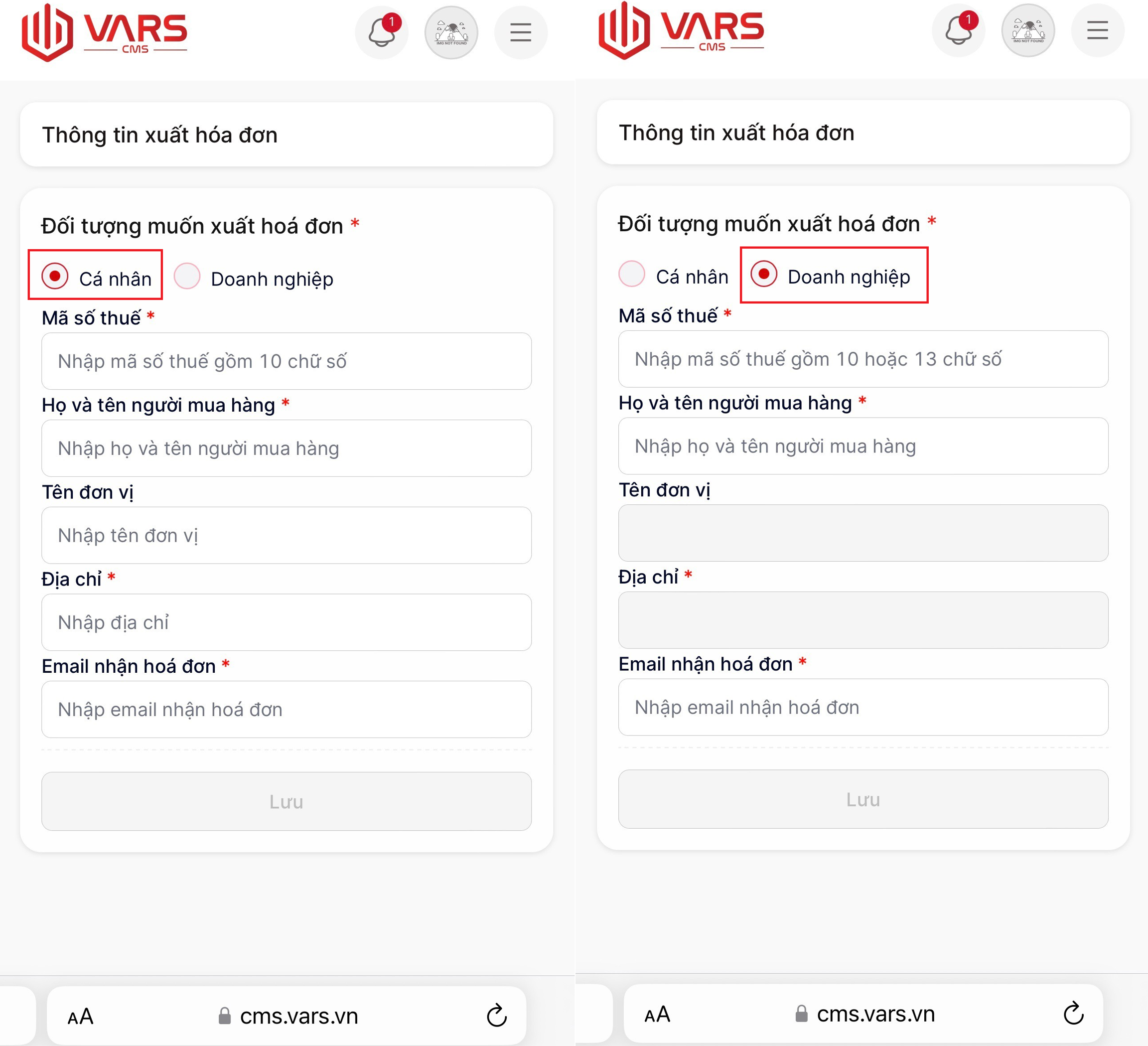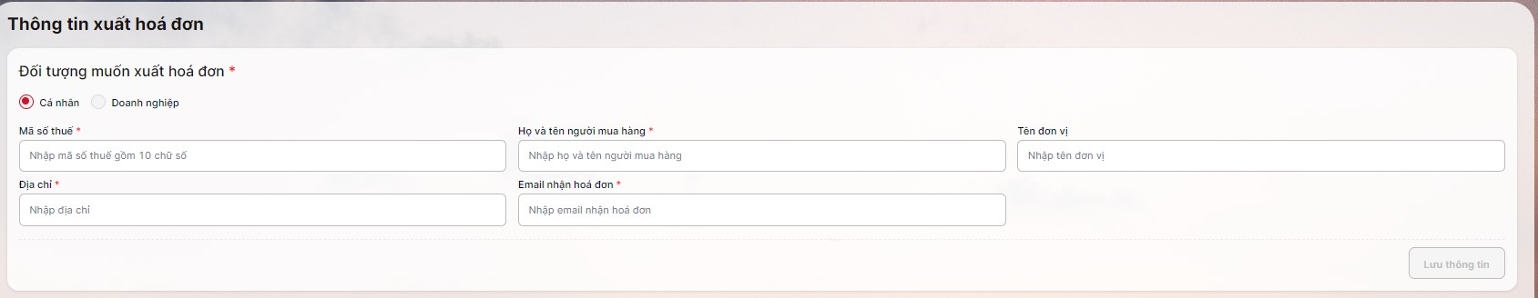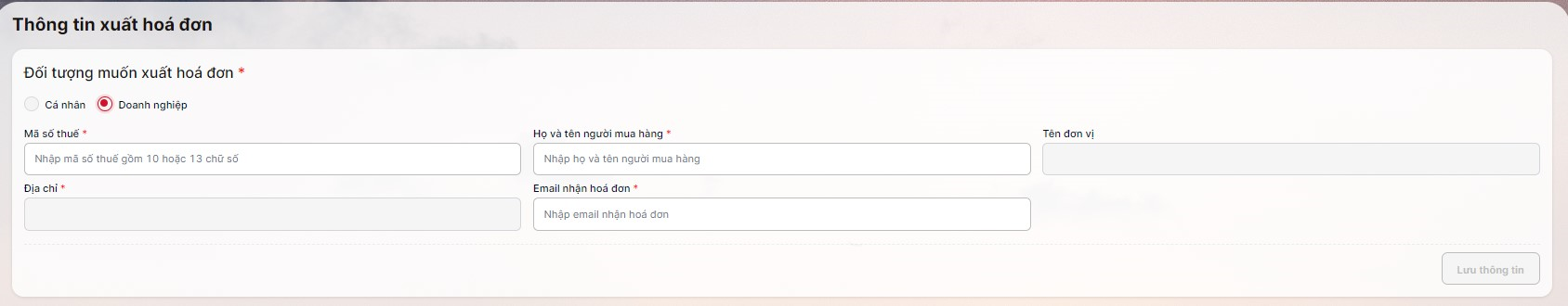 Bước 5: Hệ thống chuyển sang màn hình Thông tin xuất hóa đơn, bạn chọn Đối tượng muốn xuất hóa đơn (Cá nhân/Doanh nghiệp), điền Mã số thuế, Họ và tên người mua hàng, Tên đơn vị (nếu có), Địa chỉ và Email nhận hóa đơn. Sau đó nhấn chọn Lưu thông tin.