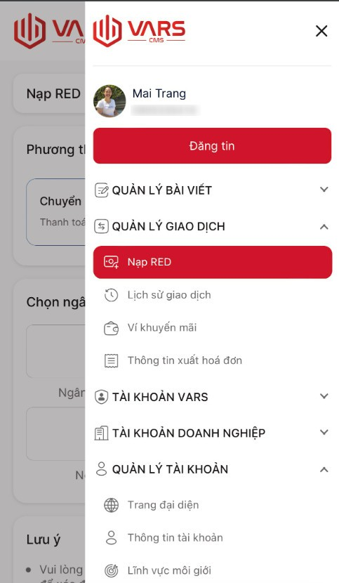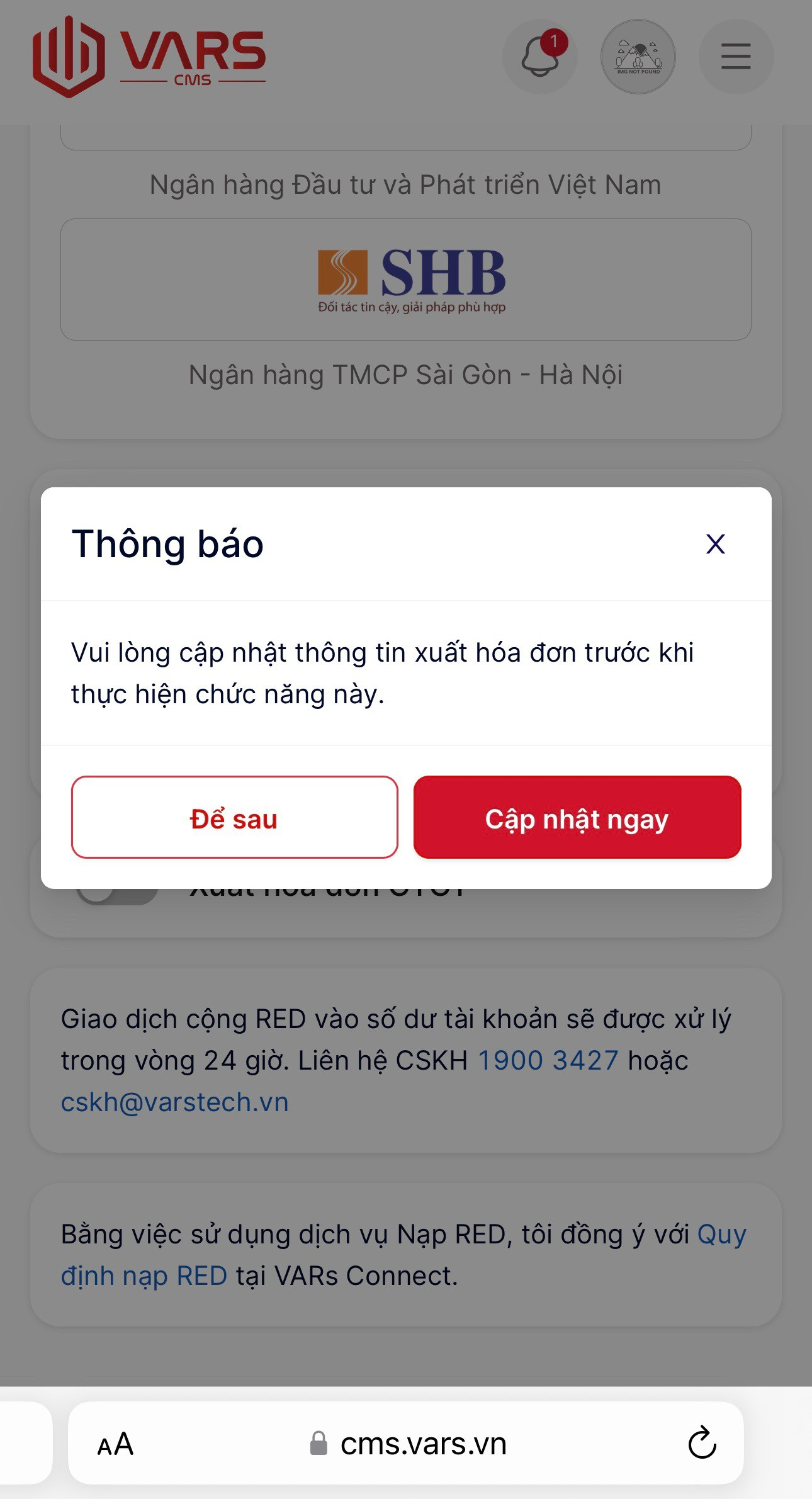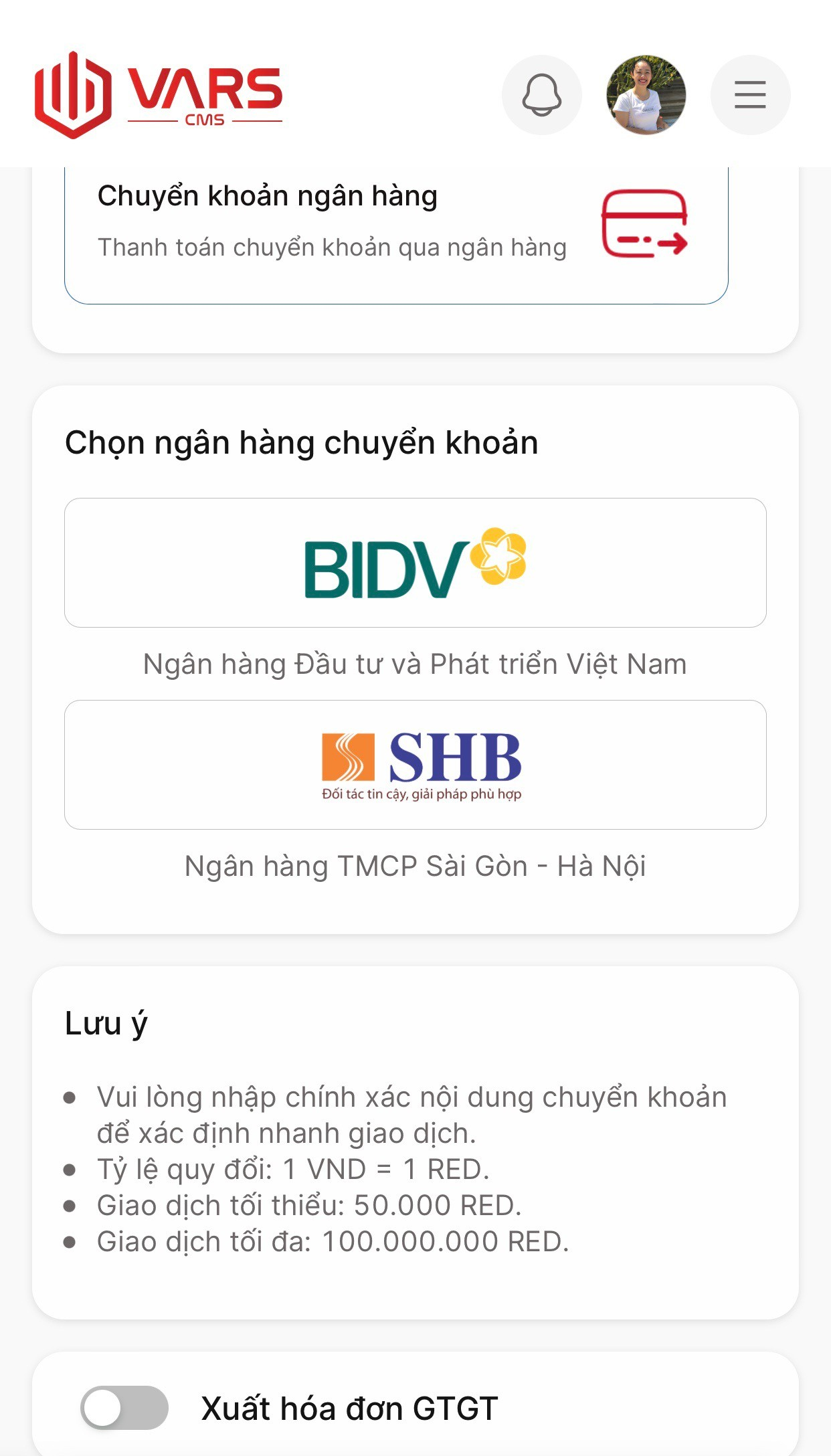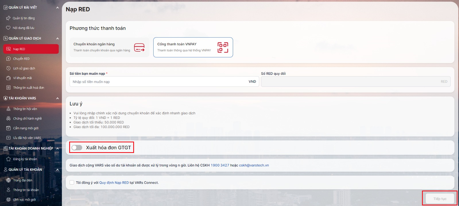 II. Hướng dẫn nạp RED qua hệ thống vars.vn