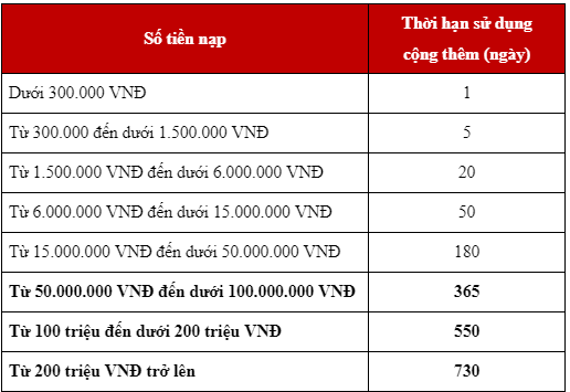 Đối với Tài khoản Chính: Thời hạn sử dụng RED trong Tài khoản Chính là 365 (ba trăm sáu mươi lăm) ngày sau khi phát sinh giao dịch nạp RED lần đầu thành công. Kể từ lần nạp tiếp theo, thời hạn sử dụng RED sẽ được cộng thêm theo quy định cụ thể ở bảng bên dưới như sau: