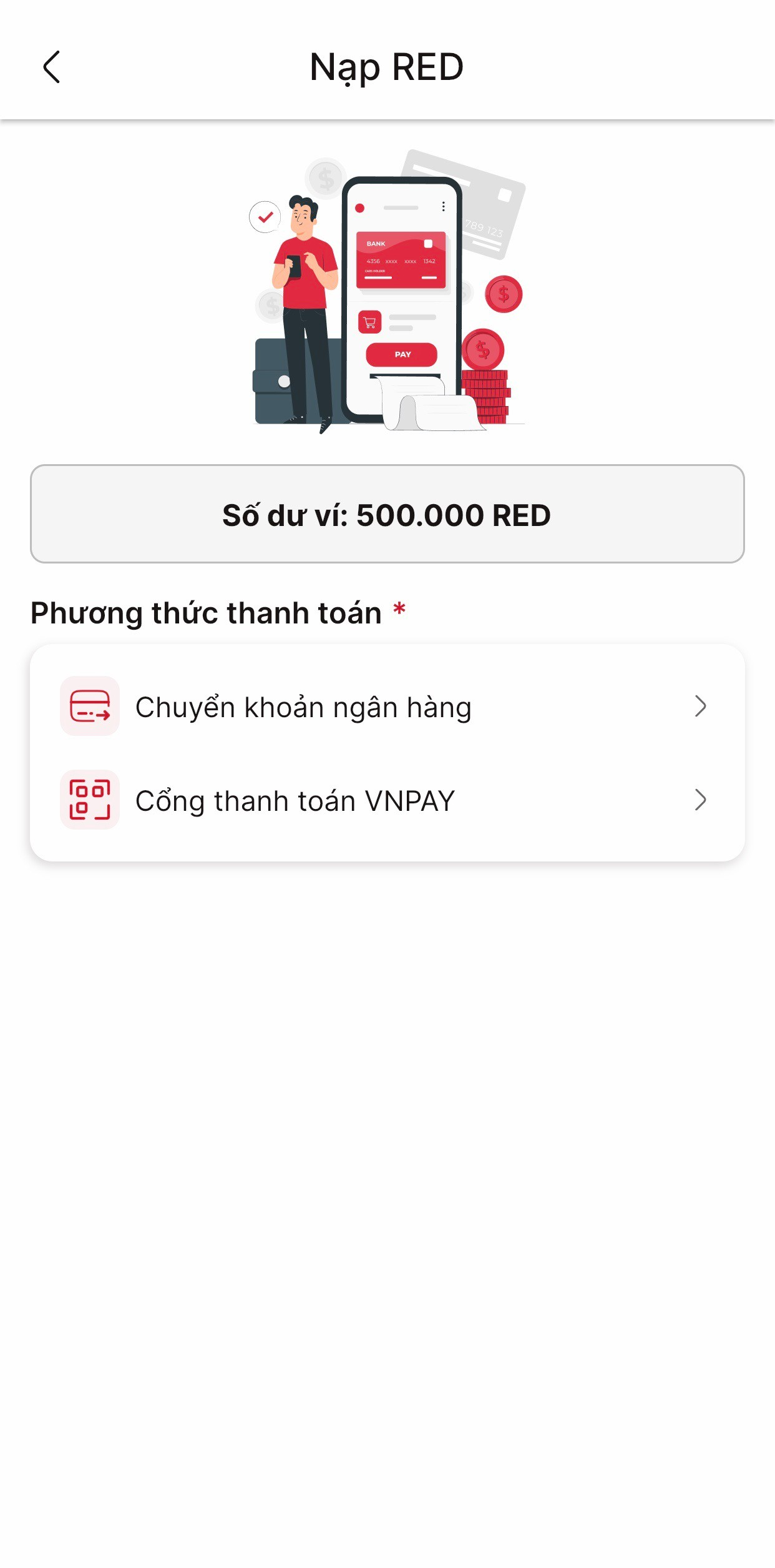 Bước 3: Tại màn hình Nạp RED chọn phương thức bạn muốn thực hiện: Chuyển khoản ngân hàng hoặc Cổng thanh toán VNPAY.