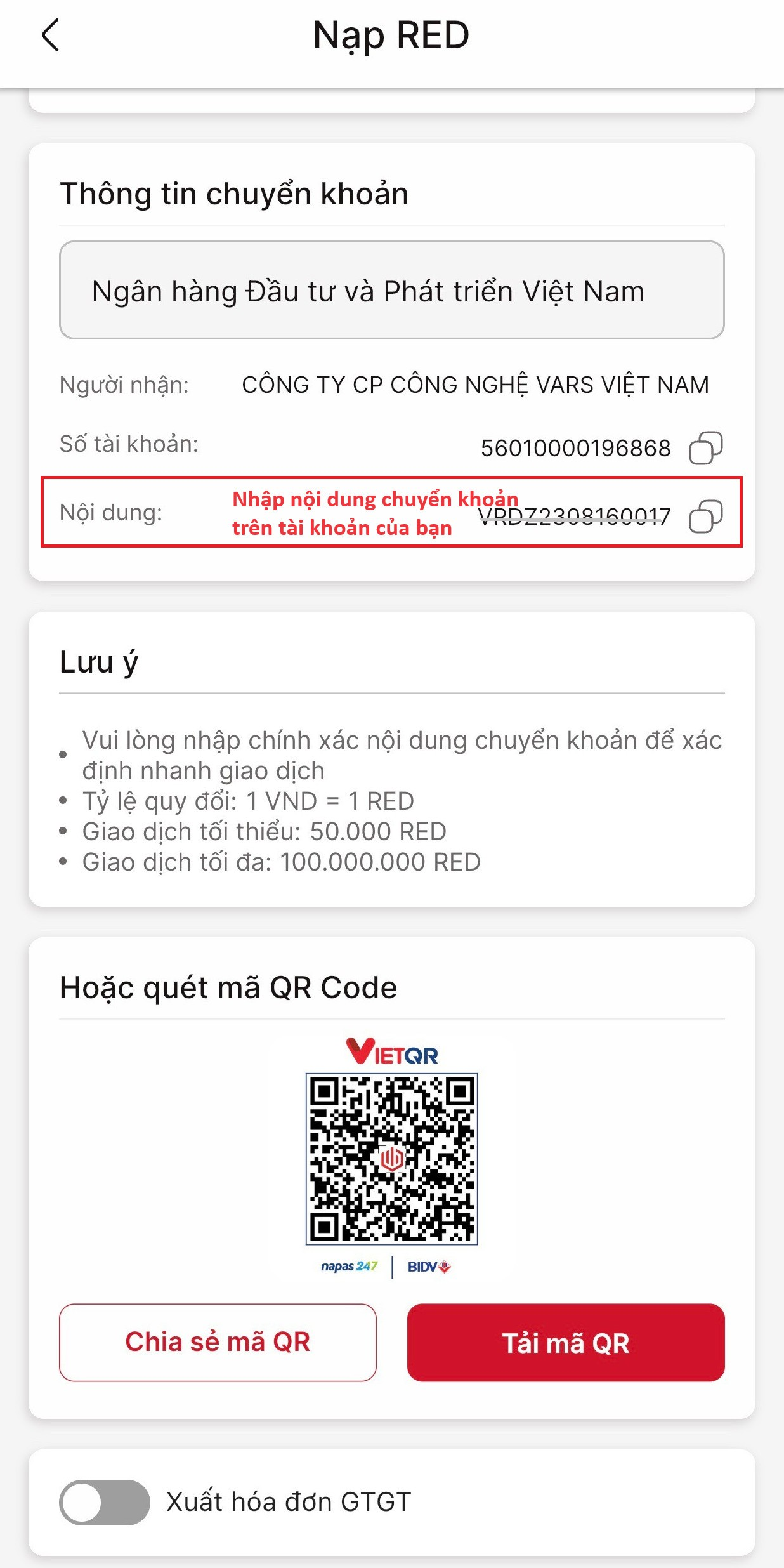 Cách 1: Phương thức Chuyển khoản ngân hàng. Tại màn hình Nạp RED, bạn có thể xem thông tin ngân hàng để chuyển khoản hoặc sử dụng mã QR để thanh toán.