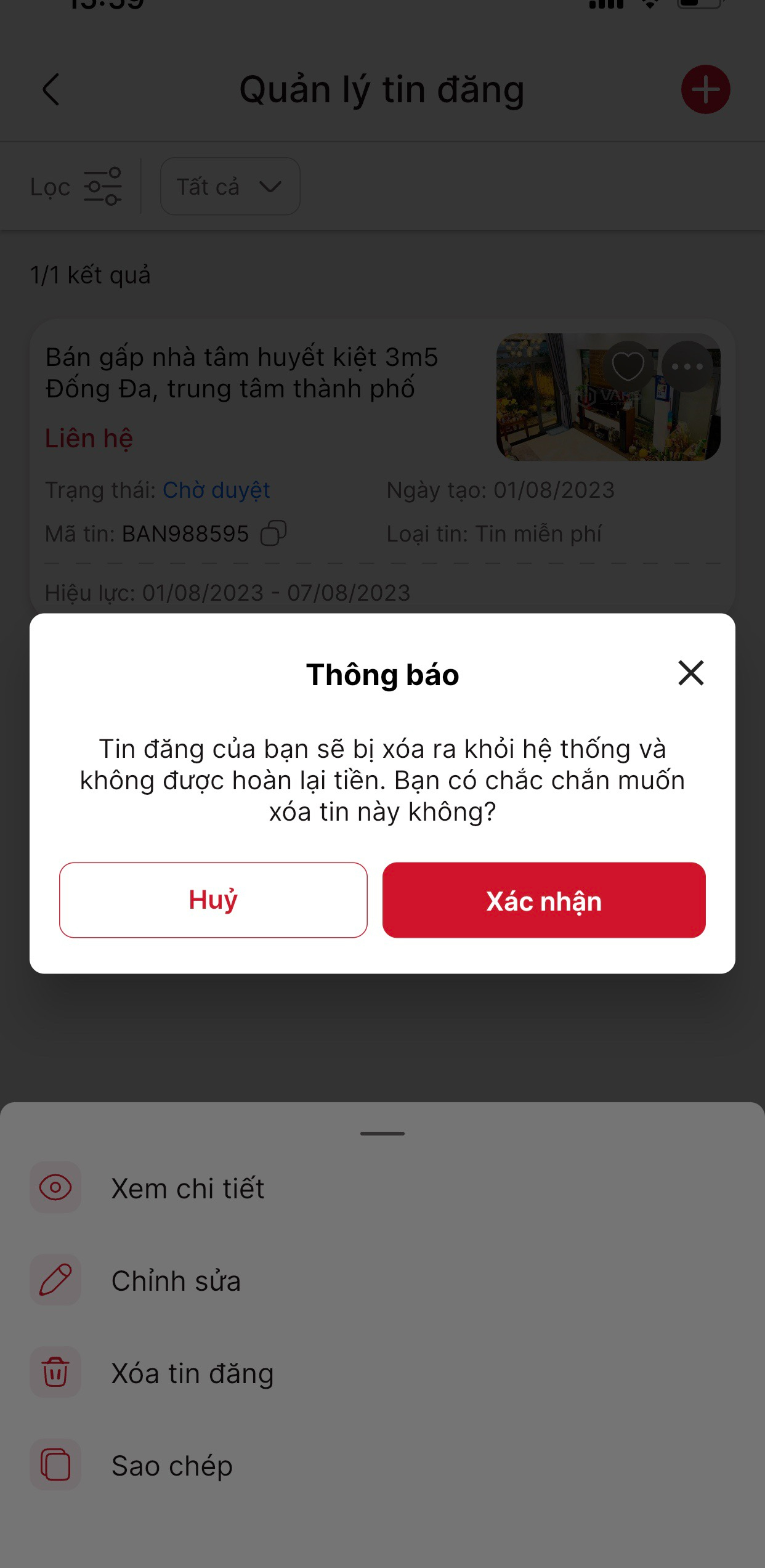 **Bước 3**: Hệ thống sẽ gửi **Thông báo** xác nhận xóa tin đăng. Nhấn chọn **Xác nhận** để hoàn tất việc xóa tin. Nhấn **Huỷ** nếu bạn không muốn xoá tin đăng nữa.