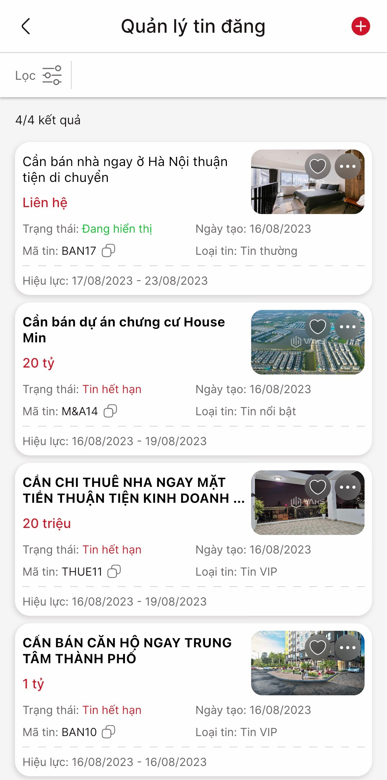 **Bước 4**: Để tìm kiếm tin đăng, tại màn hình **Quản lý tin đăng** bạn nhấn vào biểu tượng **lọc** <img src="https://content.gitbook.com/content/9EgKjWbun4juwyJmxoyZ/blobs/ae5ZBzxylWHtK2HPZuce/image.png" alt="" data-size="line">. Chương trình cho phép tìm kiếm theo: Loại tin đăng, Trạng thái của tin, Ngày tạo tin hoặc Tình trạng giao dịch.