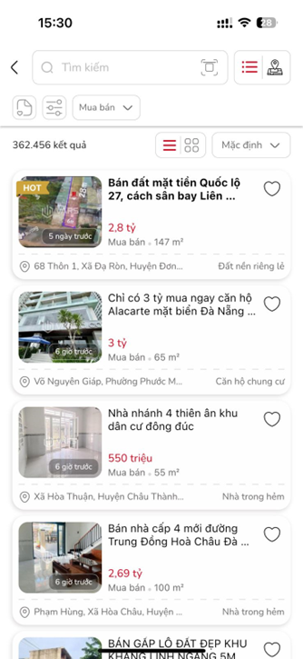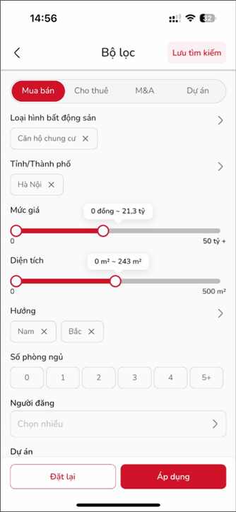 Bước 2: Tại màn hình Tìm kiếm, nhập từ khóa địa chỉ/tên của BĐS/Dự án vào thanh công cụ tìm kiếm. Ngoài ra bạn cũng có thể kết hợp với bộ lọc thông tin BĐS để cho ra kết quả chính xác nhất bằng cách nhấn vào biểu tượng Lọc và chọn các tiêu chí lọc như: Loại hình BĐS, Khu vực (Tỉnh/Thành phố), Mức giá, Diện tích, Hướng, Số phòng ngủ, Người đăng.