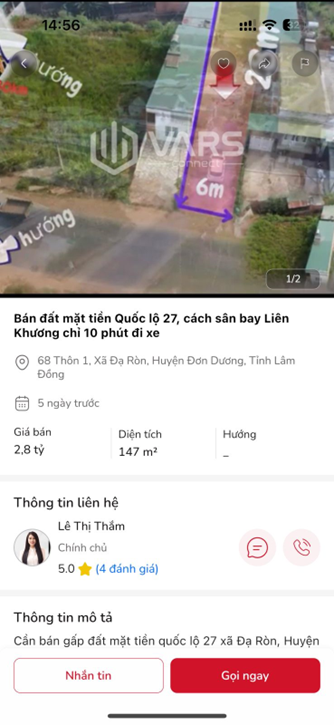 Bước 5: Tại màn hình Chi tiết tin đăng, bạn có thể kết nối trực tiếp với người đăng tin qua chức năng Nhắn tin hay Gọi Ngay hoặc nhấn vào biểu tượng