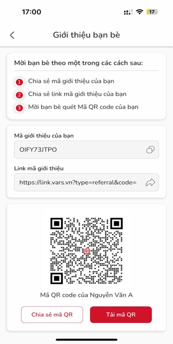 Bước 2: Tại màn hình Giới thiệu bạn bè, người dùng sao chép Mã giới thiệu, link giới thiệu hoặc mã QR giới thiệu và gửi cho bạn bè của mình.