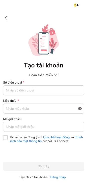 Người dùng chưa tạo tài khoản quét mã QR bằng camera điện thoại để truy cập vào Link giới thiệu, hoặc nhấn chọn trực tiếp vào Link giới thiệu nhận được từ bạn bè. Link giới thiệu sẽ dẫn đến màn hình Tạo tài khoản của Ứng dụng với mã giới thiệu đã được điền tự động. Người dùng chưa tạo tài khoản nhập các thông tin còn lại theo yêu cầu, nhấn chọn tôi “Tôi xác nhận đồng ý với Quy chế hoạt động và Điều khoản bảo mật thông tin của VARs Connect” và nhấn chọn Đăng ký để hoàn thành việc mở tài khoản.